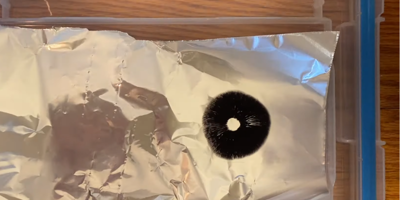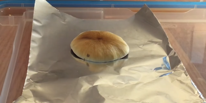 Luego coloca el sombrero de la seta con las branquias boca abajo sobre el papel de aluminio, de esta manera podrás extraer las esporas de Psilocybe Cubensis. El papel de aluminio no solo es más estéril (es fácil de limpiar con alcohol), sino que también es mejor para raspar las esporas, ya sea para hacer jeringas de esporas o para propagar micelio mediante placas de agar.